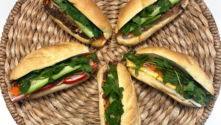 Crisp baguettes filled with savory fusion meats and fresh herbs.