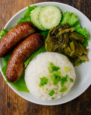 Our rice dishes feature our house-made Lao sausage and fermented mustard greens, bringing a comforting, homestyle depth to every bowl.